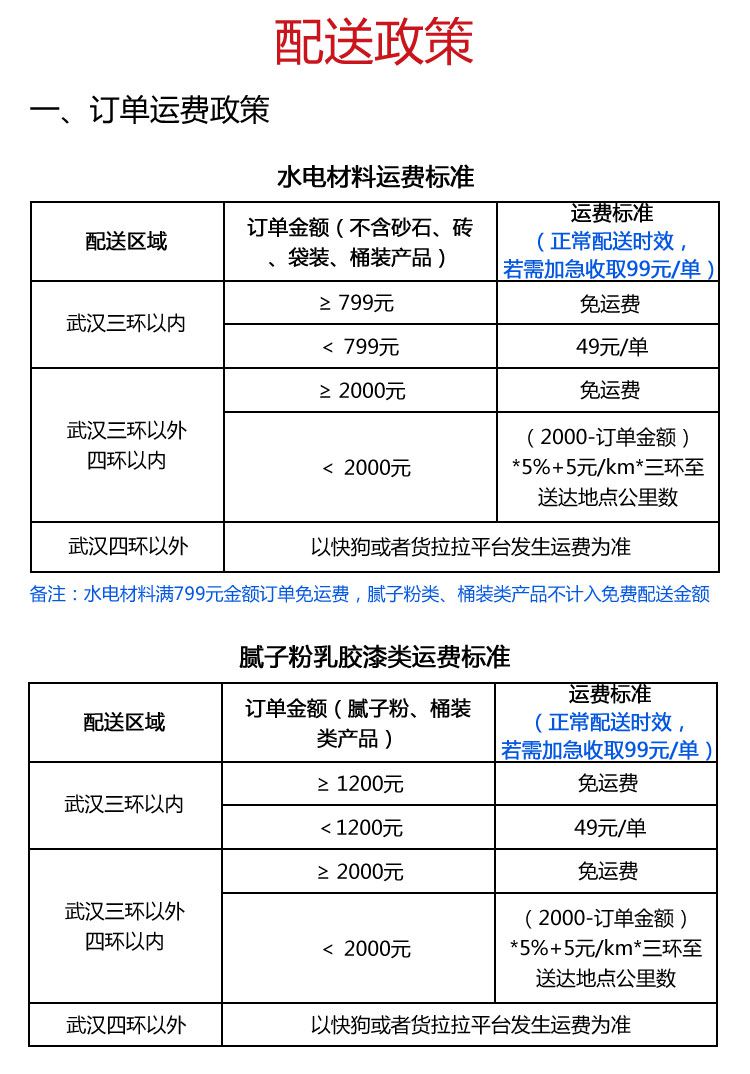 配送区域及收费标准 配送答疑 售后电话 1.请问如何联系到给我送货的快递员? 可以拨打云辅材平台400客服热线由我们帮您查询。 2.可以上门自提吗? 可以自提。云辅材 有白沙洲恒钢物流园和临空港两大仓库,可以就近自提,自提不会额外退运输费用。 3.可以指定时间段送货吗? 1.上午12:00前审单,下午20:30前完成配送 2.当日12:00-17:30前审单次日13:00前完成配送 3.当日17:30后审单,视为次日12:00前下单 4. 订单加急收取99元订单加急费用 4.配送地址可以修改吗? 可以。在货物发出前,发现地址填写错误,及时联系售后更改配送地址,可以免费修改配送地址,配送运费根据新的地址,多退少补。配送时效从更改地址的时间为下单时间开始计算。在货物发出途中和送达后,需要更改地址的,需另外再支付配送运费,配送时效从更改地址的时间为下单时间开始计算。 售后电话:400-027-0288